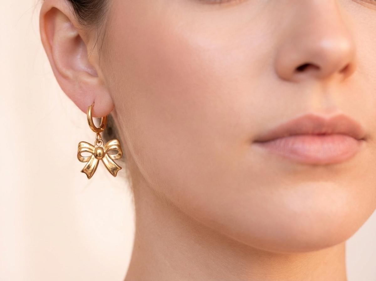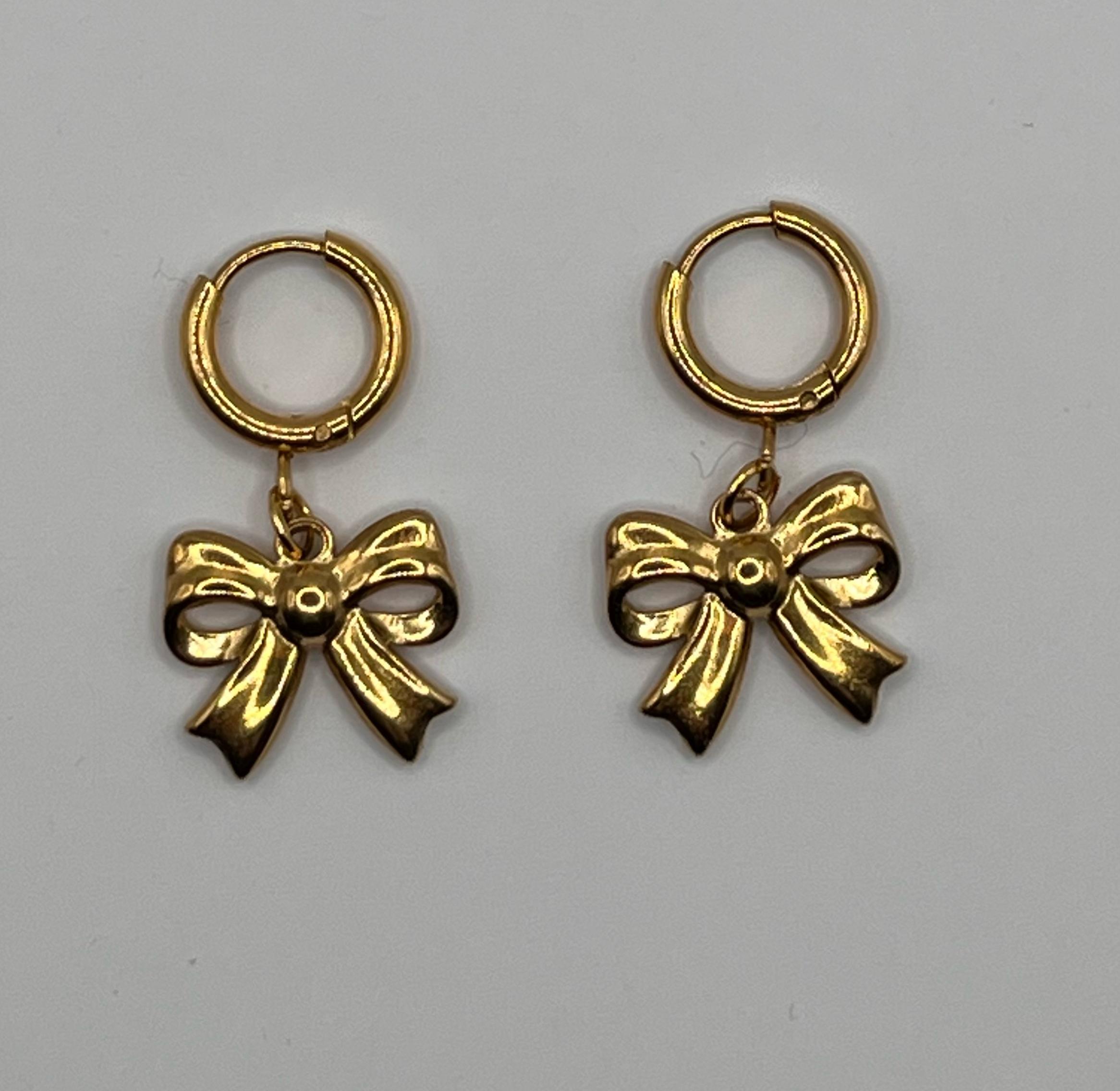 Deze goudkleurige oorbellen zijn gemaakt van roestvrij staal (RVS) en hebben een speels hangend strikje. De kleine hoops bewegen soepel mee en geven een lichte, elegante uitstraling.