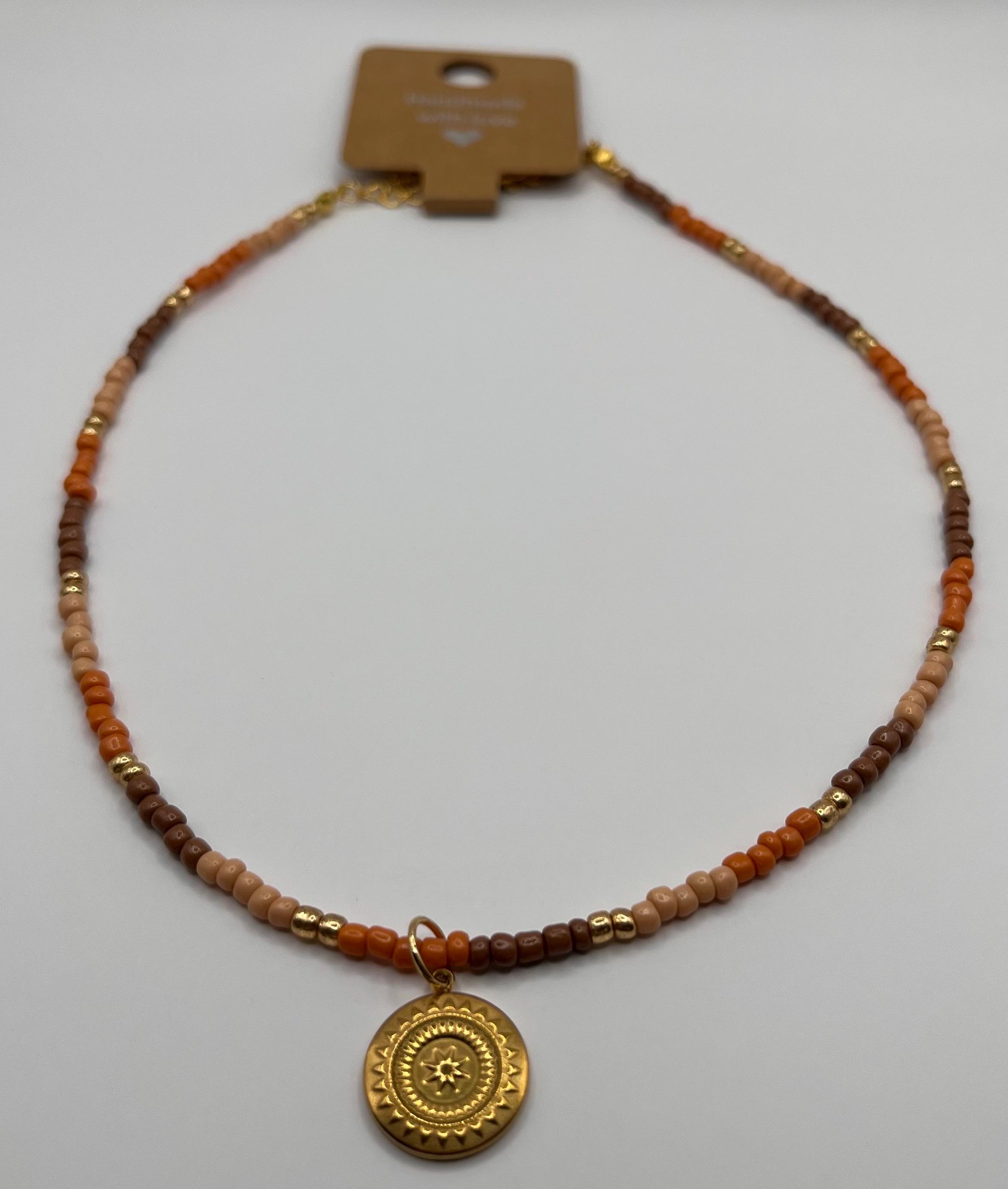 Deze kralenketting is gemaakt van kleine beads in warme tinten, gecombineerd met een goudkleurige hanger. De ketting bestaat uit zorgvuldig geregen kralen in bruin-, beige- en oranje tinten en een metalen bedel met een fijn lijnmotief.