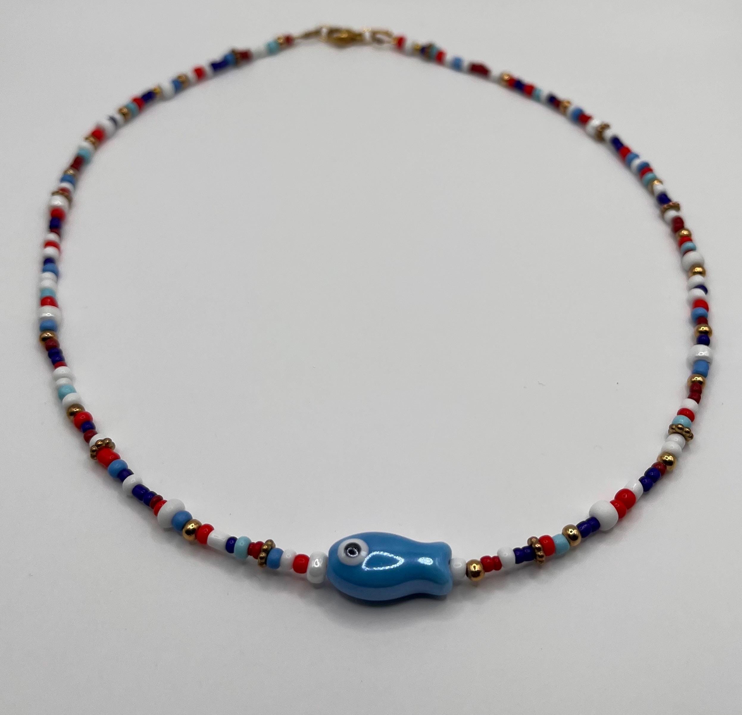 Deze handgemaakte kralenketting bestaat uit kleine beads in rood-, wit-, blauw- en goudtinten en is afgewerkt met een blauw vis-bedeltje als speels detail. De ketting is licht van gewicht en draagt comfortabel.